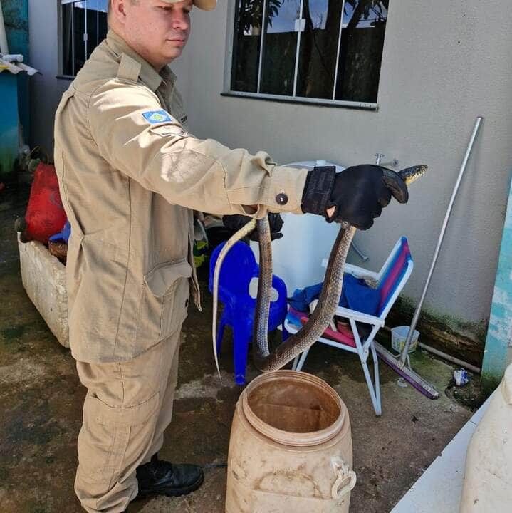 A equipe do 2º Núcleo Bombeiro Militar (2º NBM) empregou técnicas especializadas de captura e utilizou um cambão, que é uma ferramenta apropriada para o manejo seguro de animais selvagens, garantindo a segurança tanto da equipe quanto da cobra.