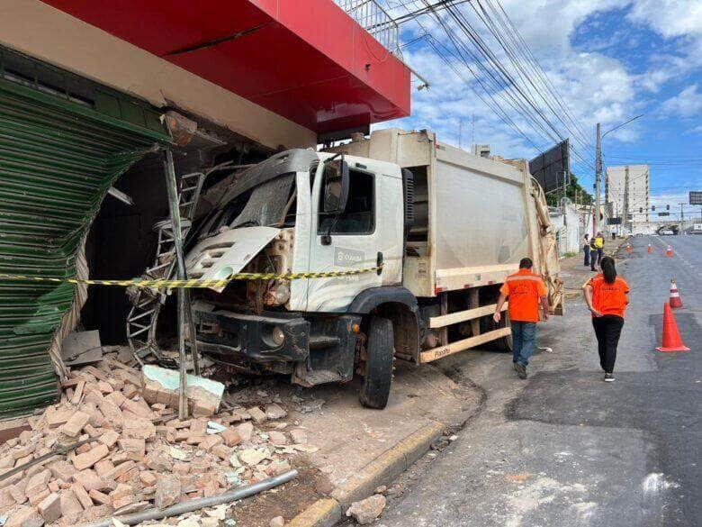 Um acidente envolvendo um caminhão de lixo da coleta seletiva de Cuiabá causou estragos na manhã desta terça-feira (27) na Avenida Isaac Póvoas, na região central da capital mato-grossense. O veículo perdeu o controle da direção e colidiu com a fachada da empresa Guaraná Maués, localizada na esquina com a Rua Jessé Pinto Freire.