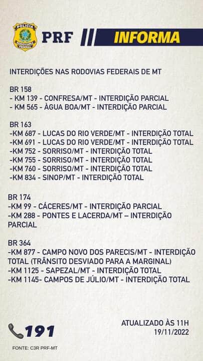 Segundo a última atualização da Polícia Rodoviária Federal, das 11h da manhã deste sábado, Mato Grosso tinhas 13 pontos interditados total ou parcialmente. A informação foi publicada no Twitter da corporação.