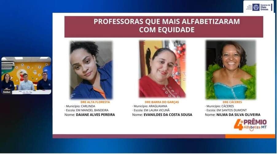 Duas escolas da Rede Municipal de Ensino de Cáceres foram reconhecidas no 4º Prêmio Alfabetiza MT, anunciado na manhã desta segunda-feira (02/06) pelo secretário de Estado de Educação, Alan Porto, durante uma transmissão ao vivo, onde foram anunciadas as 100 escolas com melhor desempenho em alfabetização em todo Mato Grosso. A premiação tem como objetivo reconhecer e incentivar escolas e profissionais que se destacam na alfabetização de crianças até o 2º ano do Ensino Fundamental, além de promover boas práticas e ações que contribuam para a melhoria dos resultados educacionais.