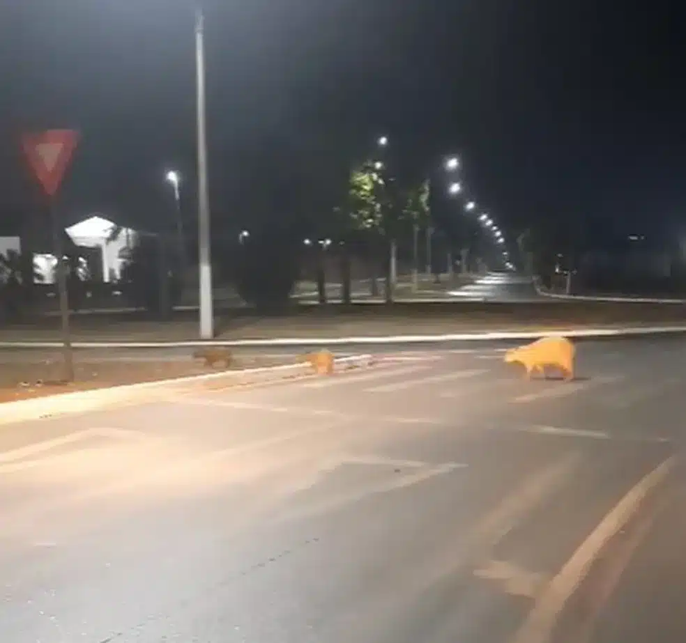 O registro foi feito por volta das 2h da manhã e no vídeo é possível ver a mãe na companhia de quatro filhotes enquanto vários carros aguardam a travessia.