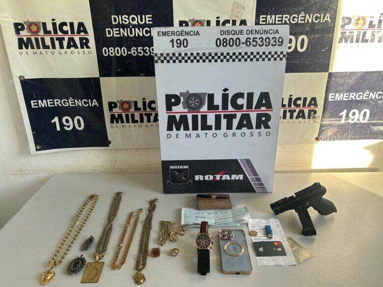 A equipe da Rotam identificou que o homem estava com um simulacro de arma de fogo do tipo pistola e uma pochete com algumas correntes de ouro. Em verificação aos seus documentos, foi identificado um mandado de prisão em aberto pela 7ª Vara Criminal de Cuiabá, expedido no ano de 2021, de onde o homem era procurado pela operação Renegados, deflagrada pelo Ministério Público do Estado.