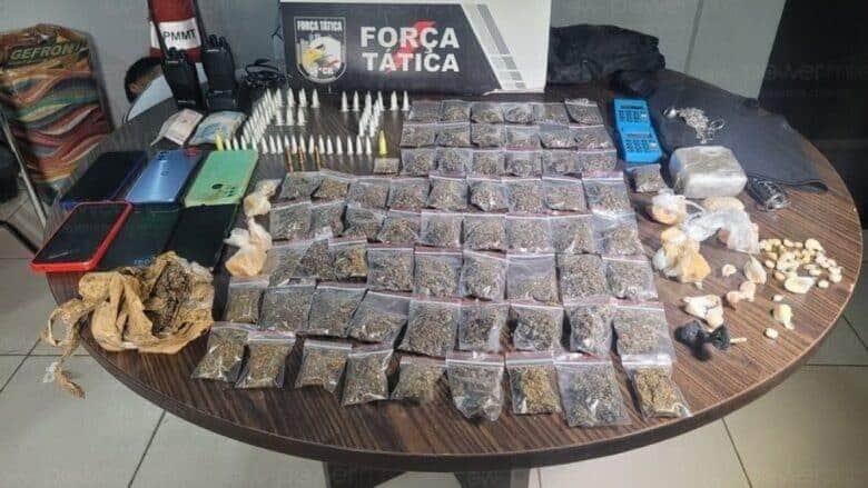 Questionado, o jovem confessou que realizava o tráfico de drogas no local há dois anos. Em uma mochila, os militares encontraram mais drogas, dinheiro, munições, máquinas de cartão, aparelhos celulares e uma sacola contendo frascos de pino vazio. No local, também foram apreendidos dois rádios HT e carregador.