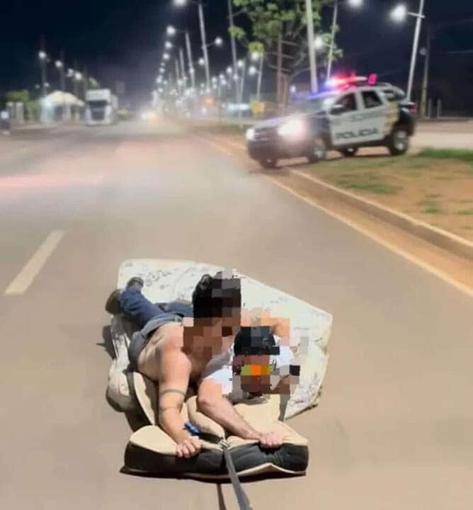 A Polícia Militar do município de Confresa-MT deteve alguns homens que estava praticando direção perigosa e colocando as próprias vidas e a vida de outras pessoas em risco. Os suspeitos estavam surfando em um colchão, que estava sendo arrastado por uma picape.