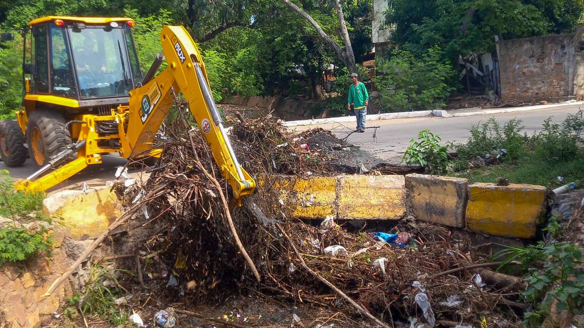 Nesta quarta-feira (5), equipes da Secretaria realizam uma grande operação de limpeza no bairro da Manga e no córrego do Aeroporto, ambos pontos que já haviam recebido ações preventivas recentemente, mas voltaram a apresentar acúmulo de resíduos e entupimentos devido ao descarte inadequado de lixo.