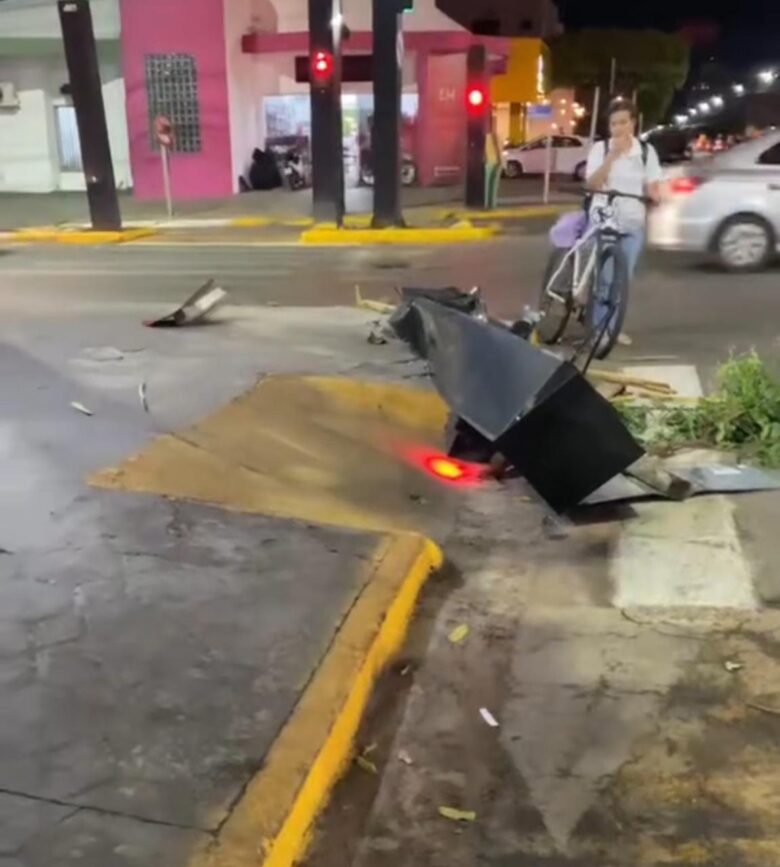No início da noite de quinta-feira (18), por volta das 18h10, uma carreta derrubou parte da estrutura de um semáforo de pedestres e duas placas de sinalização no cruzamento das avenidas Goiás e Paraná, em Lucas do Rio Verde.