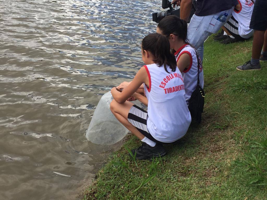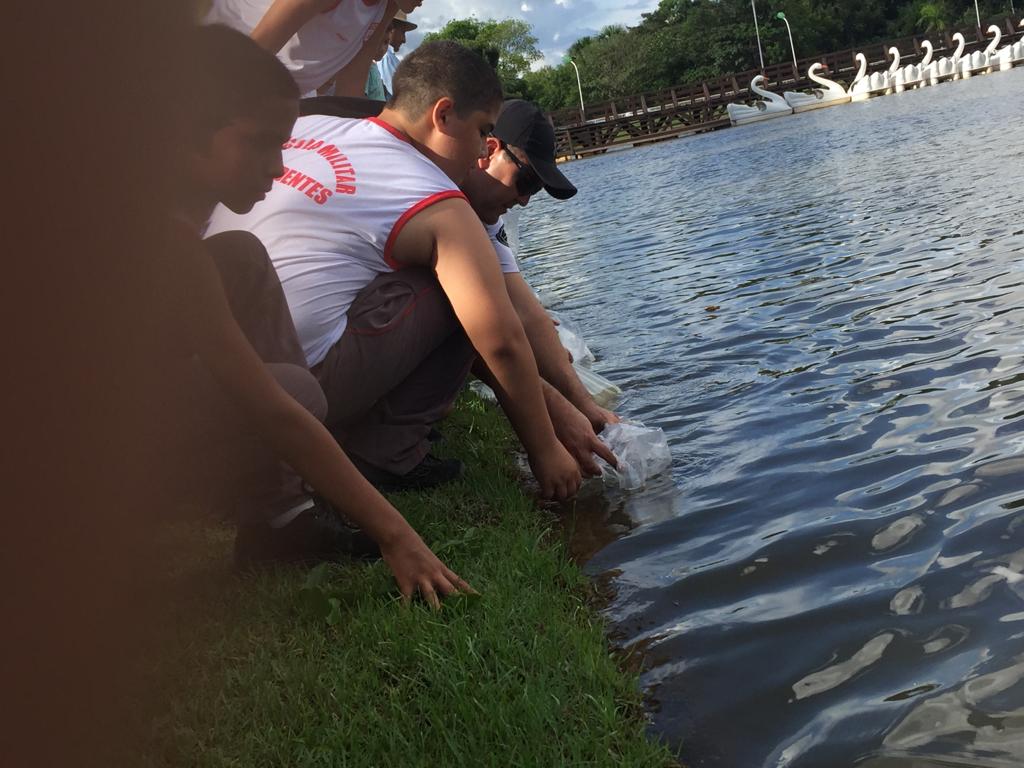 Com o objetivo de conscientização e preservação, em alusão ao Dia Mundial da Água, comemorado nessa sexta-feira (22), os alunos da Escola Militar Tiradentes de Lucas do Rio Verde-MT, participaram da soltura de 4 mil alevinos no lago Ernani José Machado, no centro da cidade.