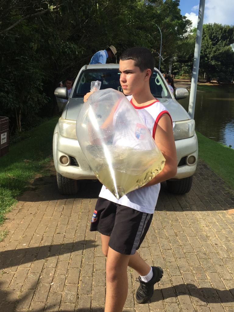 Os alunos seguiram até o píer, onde receberam os peixes e fizeram a soltura, simbolizando a importância de manter o lago conservado e povoado com espécies da nossa região, bem como os cuidados com a água.