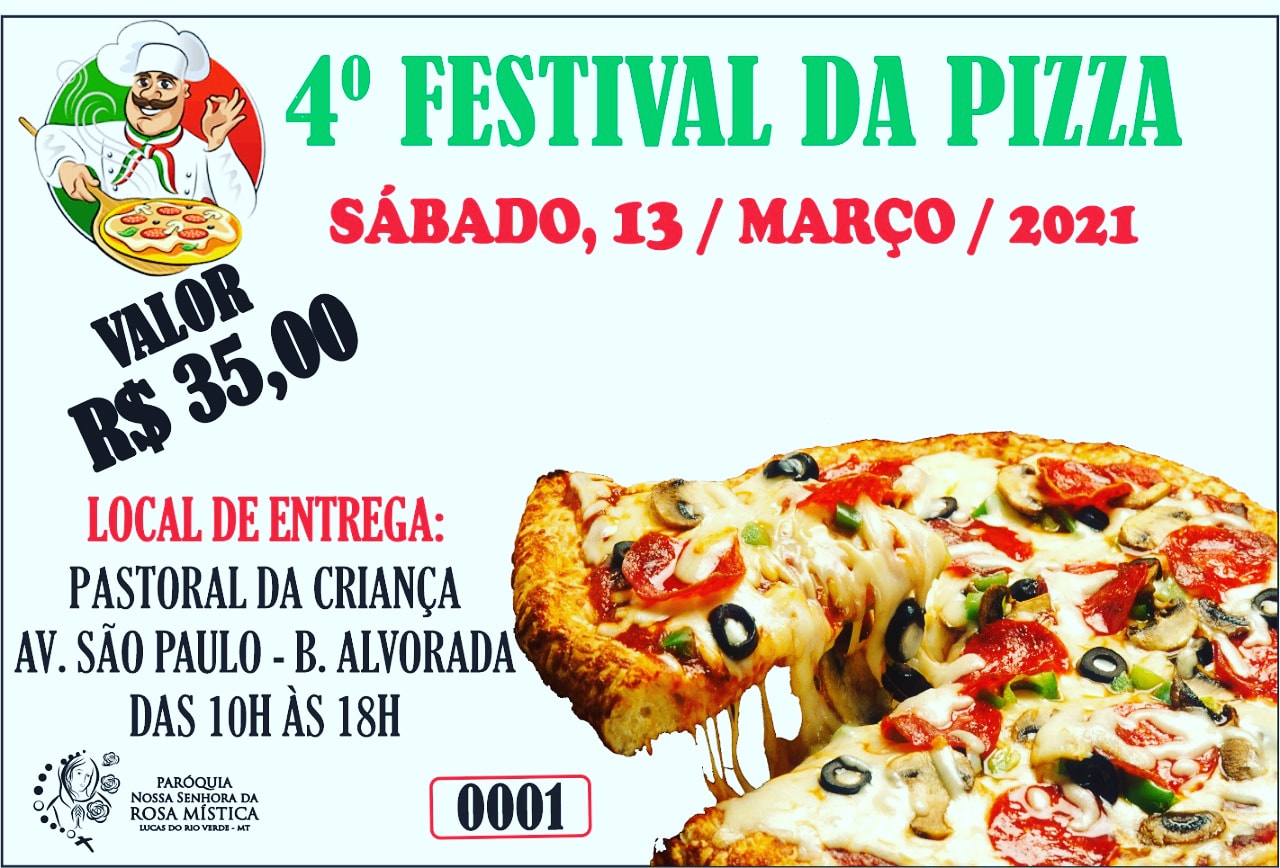 A comunidade católica da Paróquia Rosa Mística promove no próximo sábado, 13 de março, a 4ª edição do Festival da Pizza. As pizzas estão sendo comercializadas ao valor de R$ 35,00 e a retirada acontecerá a partir das 09h00 até as 18h00, na sede da Pastoral da Criança, localizada na Avenida São Paulo, ao lado do antigo Batalhão da Polícia Militar, no bairro Alvorada.