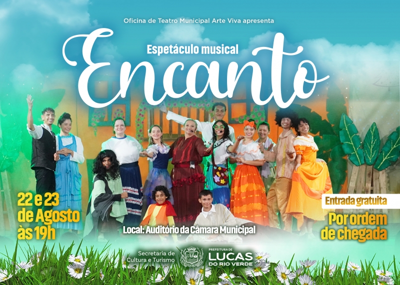 A Prefeitura de Lucas do Rio Verde, por meio da Secretaria de Cultura e Turismo, convida a comunidade para viver momentos de arte, emoção e encantamento nesta sexta e sábado (22 e 23 de agosto). O Espetáculo Encanto terá duas apresentações, ambas às 19h, no auditório da Câmara Municipal.