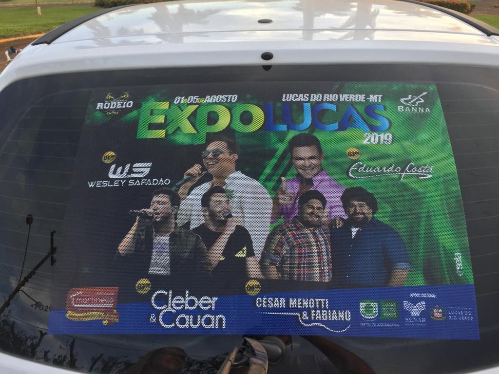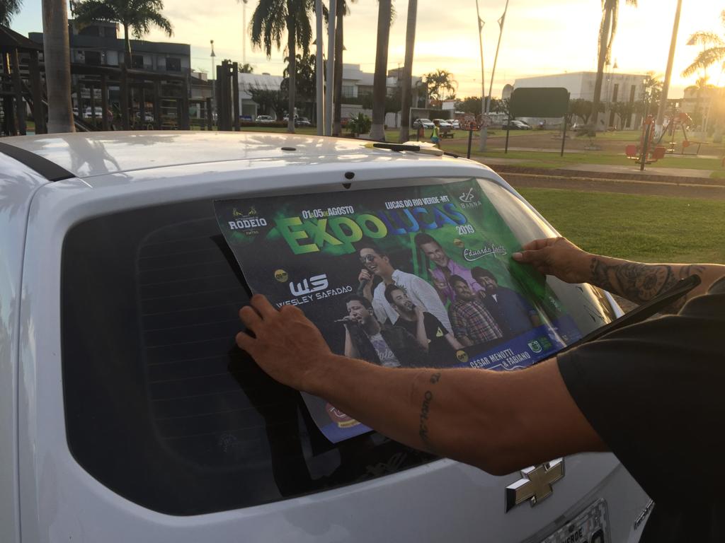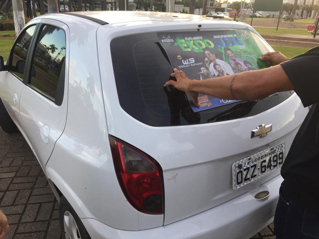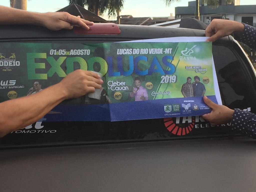 Na tarde dessa sexta-feira também foram adesivados 100 carros, onde o proprietário do veículo permanecendo com o adesivo até o inicio da Expolucas, terá direito a uma cartela. Foi realizado um cadastro e retirado uma senha para que fosse aplicado o adesivo. A ação aconteceu na praça central de Lucas do Rio Verde.