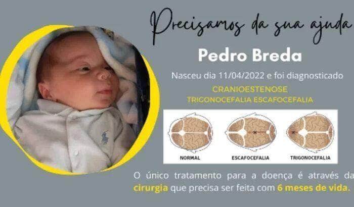 A família de Pedro Breda Diniz luta contra o tempo para arrecadar dinheiro e garantir uma cirurgia ao recém-nascido. Pedro, filho de Elias e Priscilla, foi diagnosticado com cranioestenose trigonocefalia escafalocefalia. Ele tem 45 dias e precisa passar por uma cirurgia de correção craniana. O procedimento é avaliado em R$ 200 mil e deve ser feito até o sexto mês de vida.