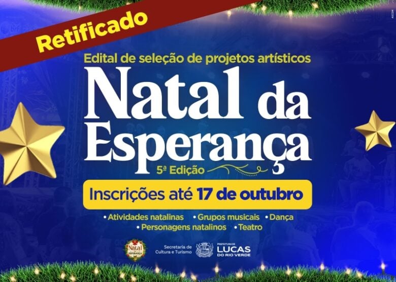 A Prefeitura de Lucas do Rio Verde, por meio da Secretaria de Cultura e Turismo, informa que seguem abertas até esta sexta-feira, 17 de outubro, as inscrições para o Edital de Chamamento Público que selecionará produções artístico-culturais para compor o programa cultural da 5ª edição do Natal da Esperança.