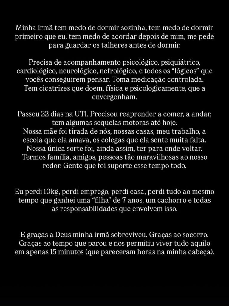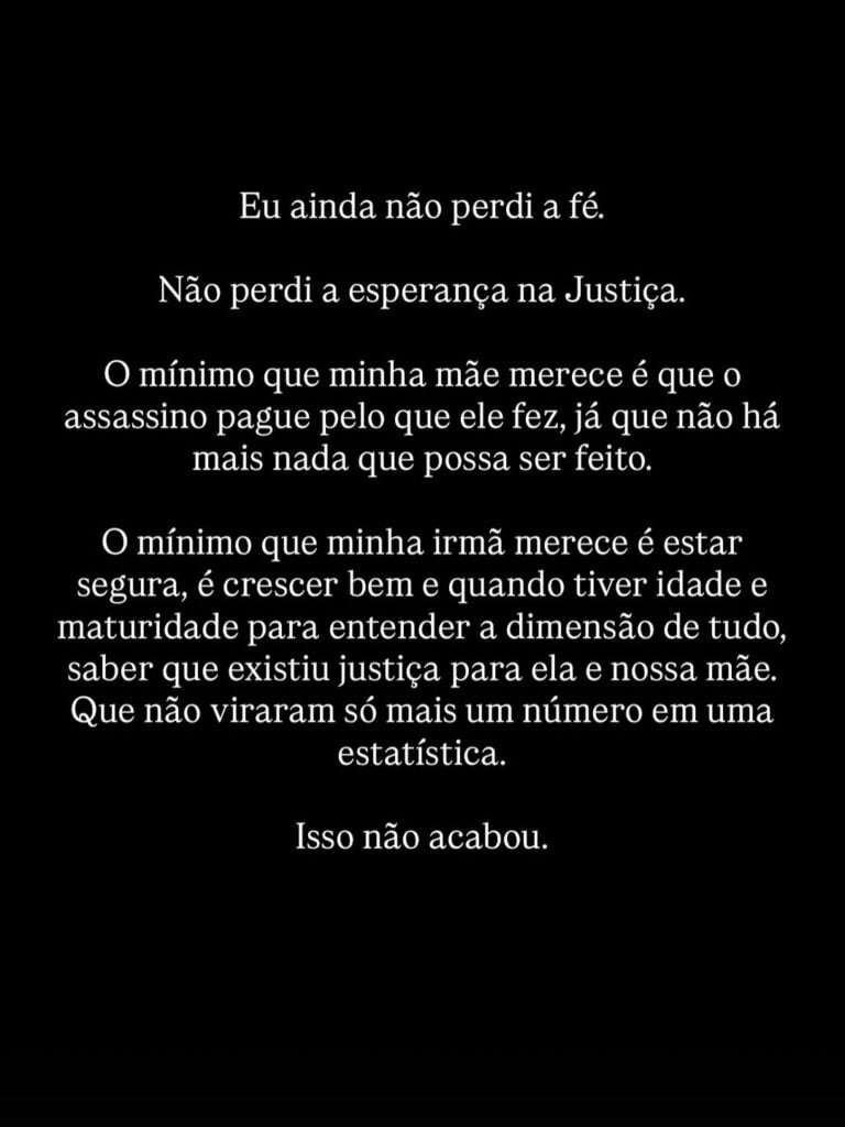 Caroline encerra o texto dizendo que ainda acredita na Justiça, apesar da dor e das marcas que o crime deixou. Para ela, o mínimo que sua mãe merece é que o assassino responda pelo que fez; o mínimo que sua irmã merece é a garantia de segurança e a certeza de que, um dia, entenderá que houve responsabilização.