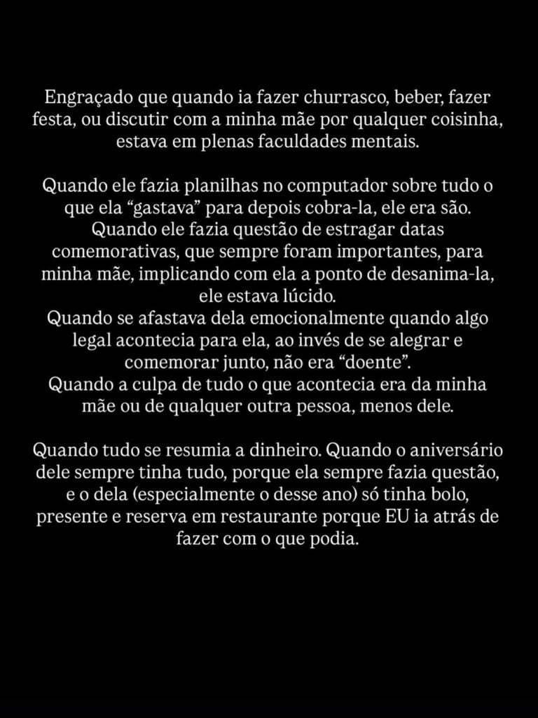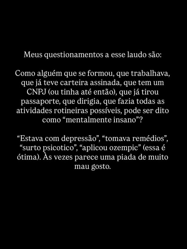 “Como alguém que se formou, que trabalhava, que já teve carteira assinada, que dirigia, que fazia todas as atividades rotineiras possíveis pode ser dito como ‘mentalmente insano’?”, questiona. No relato, ela contesta justificativas apresentadas ao longo do processo, como depressão, uso de medicamentos ou supostos surtos psicóticos. “Às vezes parece uma piada de muito mau gosto”, desabafa.