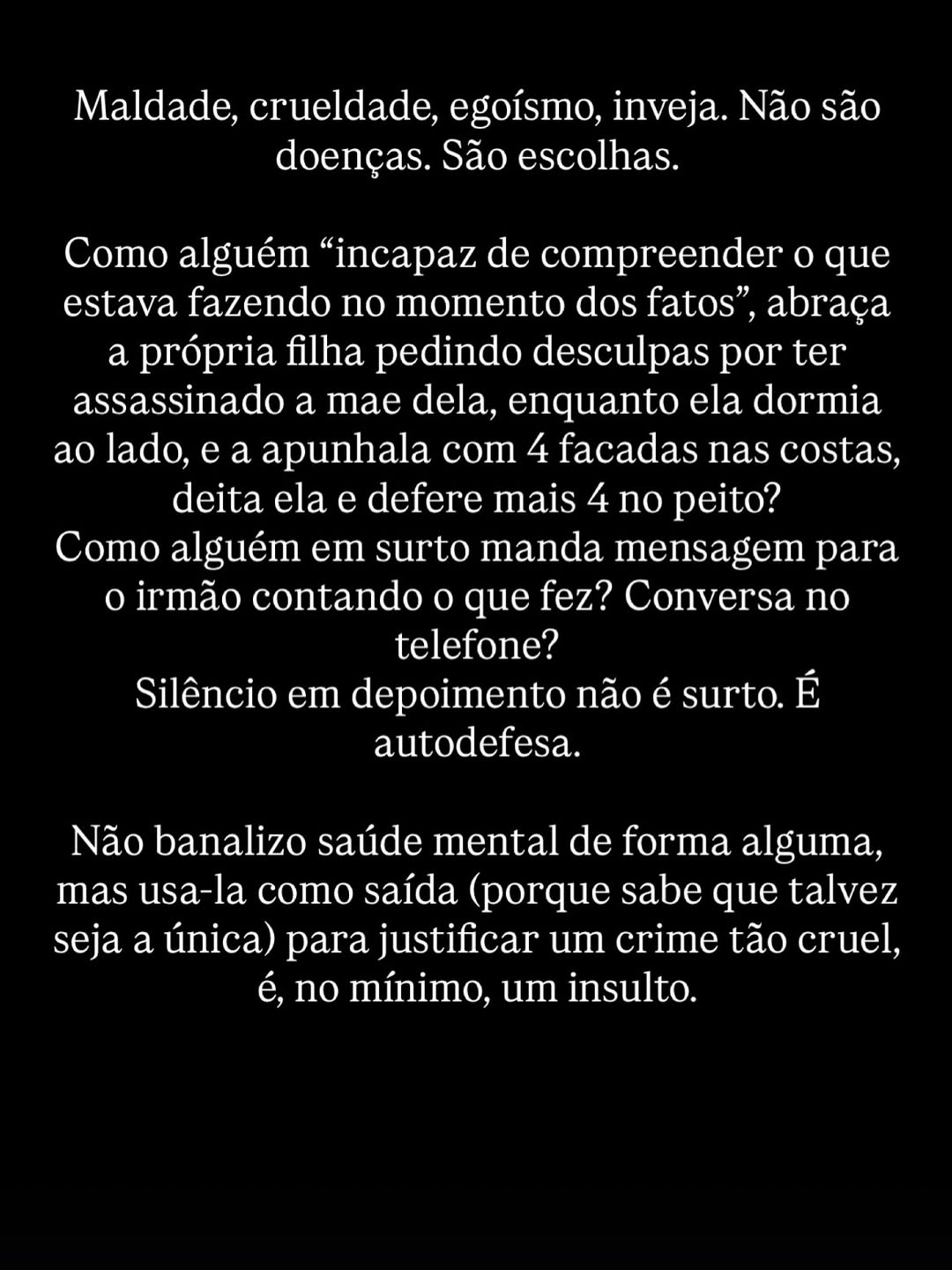 O desabafo cresce em intensidade quando ela descreve o momento do crime. Segundo a biomédica, o pai teria abraçado a filha pedindo desculpas por assassinar a mãe enquanto a criança dormia ao lado. Depois, golpeou a menina oito vezes — quatro facadas nas costas e quatro no peito. “Como alguém ‘incapaz de compreender o que estava fazendo’ faz tudo isso, liga para o irmão contando o que fez e conversa ao telefone? Silêncio em depoimento não é surto, é autodefesa”, escreve.