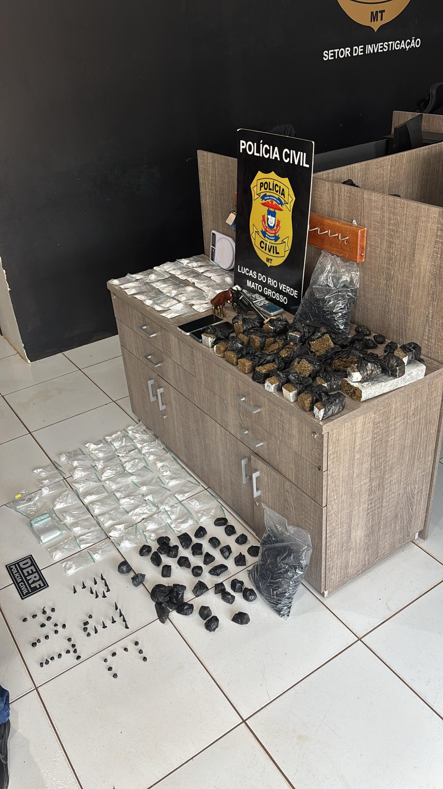 Dentro da residência, foram encontradas porções de maconha, pasta base de cocaína e uma arma de fogo, reforçando as suspeitas de que o local funcionava como base de armazenamento da facção para abastecer pontos de venda em Lucas do Rio Verde.