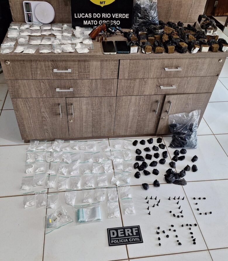 Dentro da residência, foram encontradas porções de maconha, pasta base de cocaína e uma arma de fogo, reforçando as suspeitas de que o local funcionava como base de armazenamento da facção para abastecer pontos de venda em Lucas do Rio Verde.