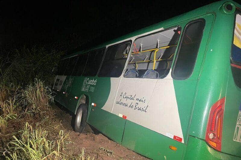 O motorista de um ônibus coletivo precisou “jogar” o transporte em uma rebanceira às margens da rodovia MT-010, em Cuiabá, Mato Grosso. Haviam cerca de sete passageiros dentro do ônibus.
