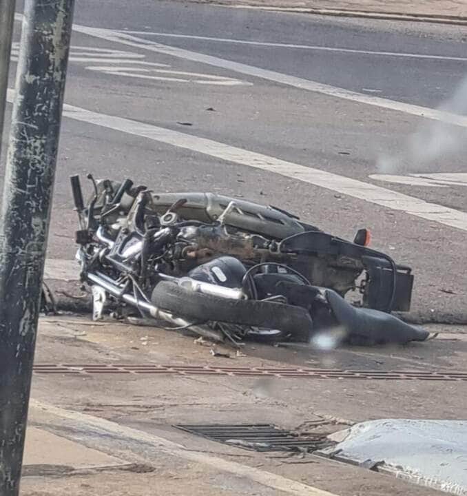 Informações indicam que o condutor da motocicleta trafegava pela Rua Fernando Correa, quando o condutor da picape, que seguia pela Avenida Bandeirantes, cruzou o sinal vermelho provocando a colisão.