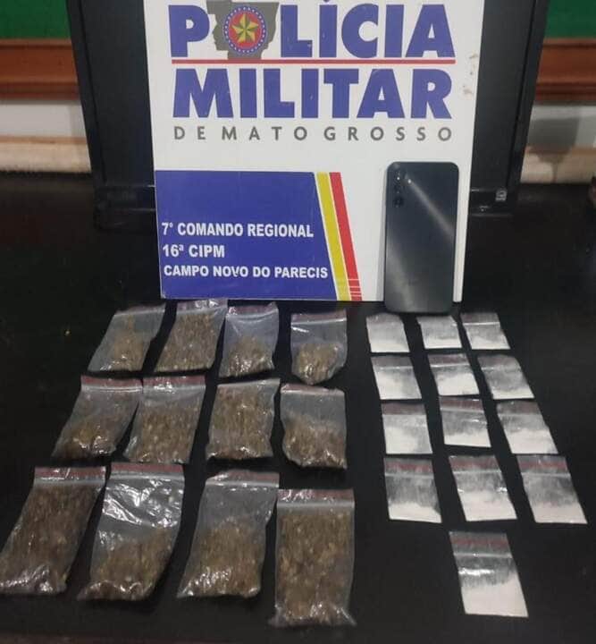 Em uma abordagem realizada em Campo Novo do Parecis, a PM interceptou um veículo Sandero ocupado por dois suspeitos, no qual foram encontradas porções de maconha e cocaína.