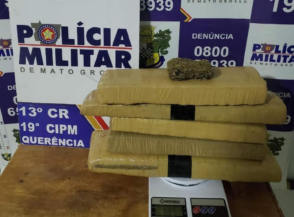 Na abordagem aos suspeitos, a PM encontrou em uma bolsa vermelha foram encontrados cinco tabletes de maconha e uma porção de maconha. Os suspeitos, relataram à PM que estavam transportando a droga para a cidade de Canarana.