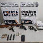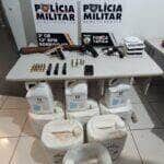 Foram apreendidos: 01 pistola 9MM; 01 espingarda calibre 22; 02 revólveres calibre 38; 04 carregadores de pistola; 20 munições de calibre 9mm intactas; 10 munições calibre 38 intactas; 01 aparelho celular; 03 balanças de precisão; 06 galões de 20 litros de fungicida e 03 galões de 5 litros Yara Vita Gotamax.
