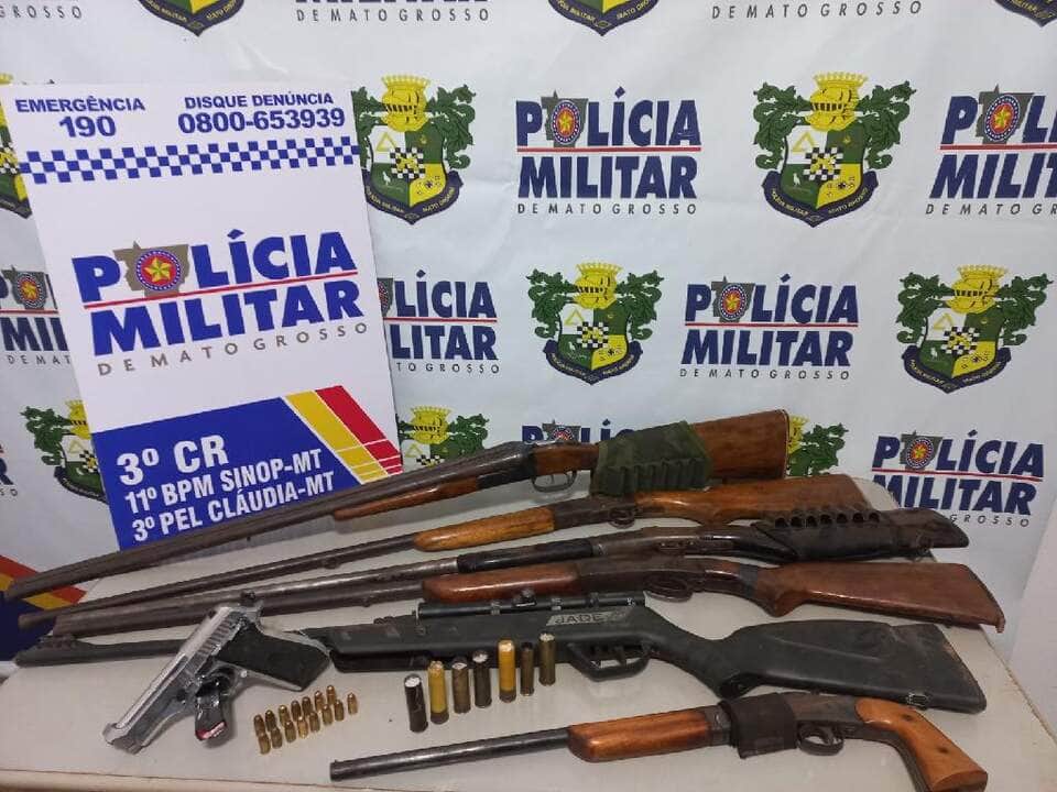 A Polícia Militar prendeu um homem de 60 anos e uma mulher de 46 anos pelo crime de posse irregular de arma de fogo, na tarde desta quinta-feira (17.11), na zona rural do município de Cláudia. Com os suspeitos, foram apreendidas seis espingardas e uma pistola, além de munições para o armamento.