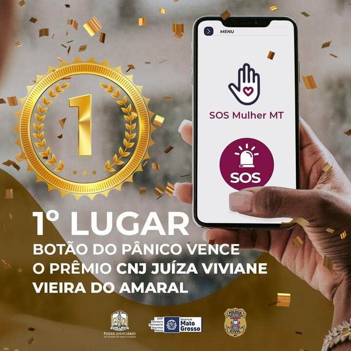 #Paratodosverem Esta matéria possui recursos de texto alternativo para promover a inclusão das pessoas com deficiência visual. Descrição de imagem: Arte colorida. É possível ver uma mão feminina segurando um celular com o app SOS Mulher MT. Ao lado um selo como número 1. Segue o texto: 1º lugar – Botão do Pânico vence o prêmio CNJ Juíza Viviane Vieira do Amaral. Assinam a peça os logos do Poder Judiciário, Governo de Mato Grosso e PJC.