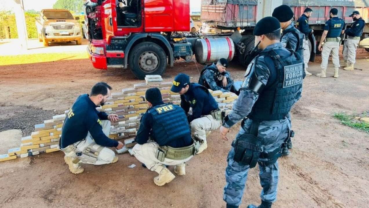 Uma ação conjunta entre a Polícia Rodoviária Federal – PRF – e Polícia Militar – PM – resultou na apreensão de 150 quilos de cocaína, 10 quilos de skunk e um armamento de grosso calibre: fuzil calibre 5.56 e 18 munições calibre 5.56 em compartimento oculto de um veículo de carga.