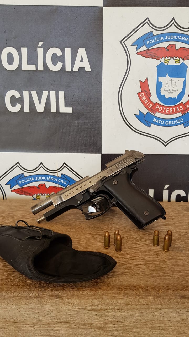 Questionado, ele confessou que tinha uma pistola 765, escondida no quintal vizinho da sua casa, a qual entregou aos policiais. Diante da situação, o suspeito foi conduzido a Delegacia de Cotriguaçu, onde após ser interrogado pelo delegado Marco Bortolotto Remuzzi, foi autuado em flagrante por posse ilegal de arma de fogo.