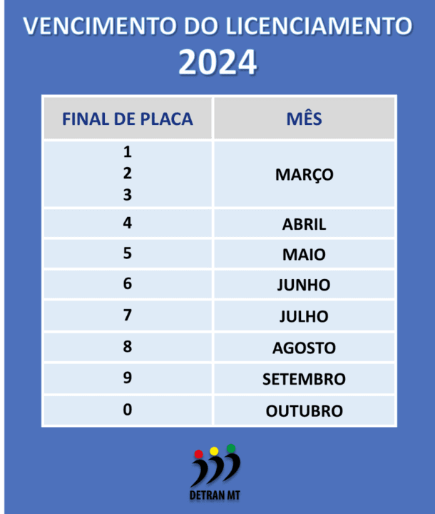 O Departamento Estadual de Trânsito de Mato Grosso (Detran-MT) alerta os proprietários de veículos com placa final quatro que o prazo para pagar o licenciamento de seus veículos acaba no dia 30 de abril.