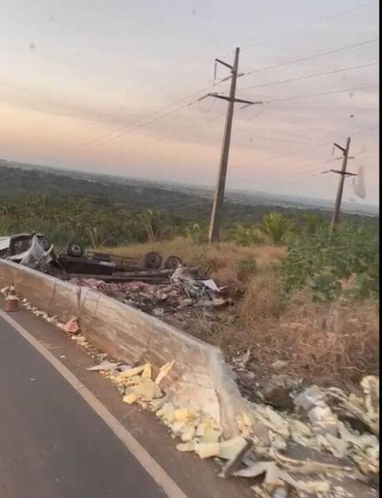 A carreta que era conduzida por Lucas, estava carregada com carnes. Parte da carga ficou espalhada pela pista.