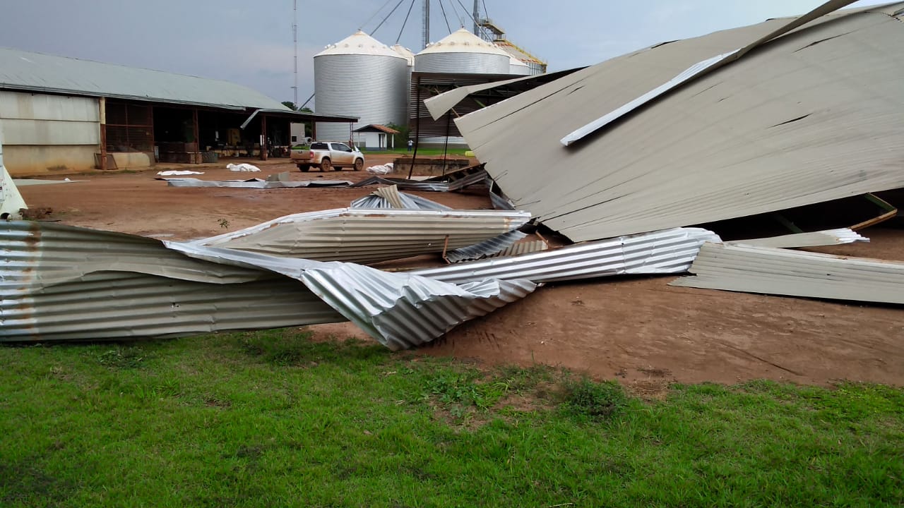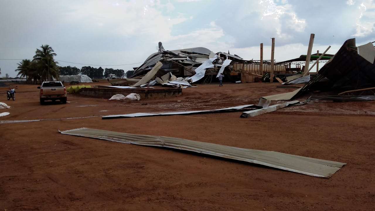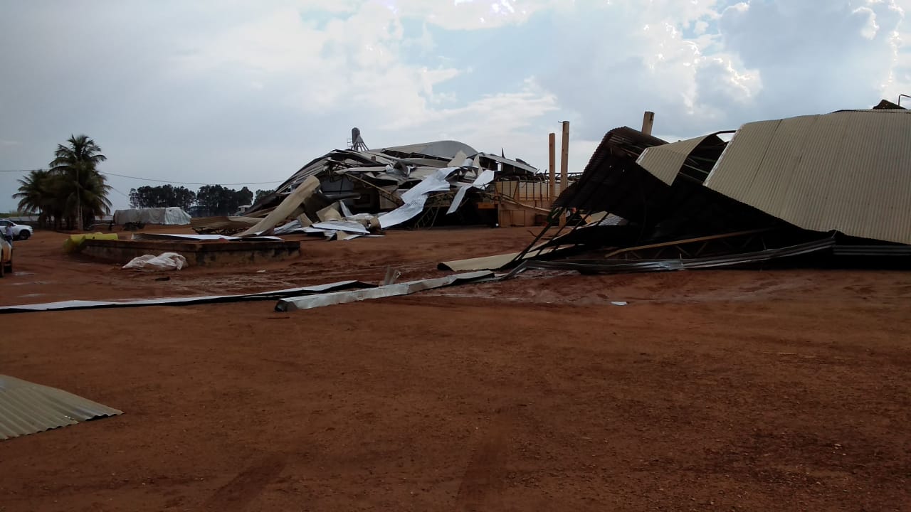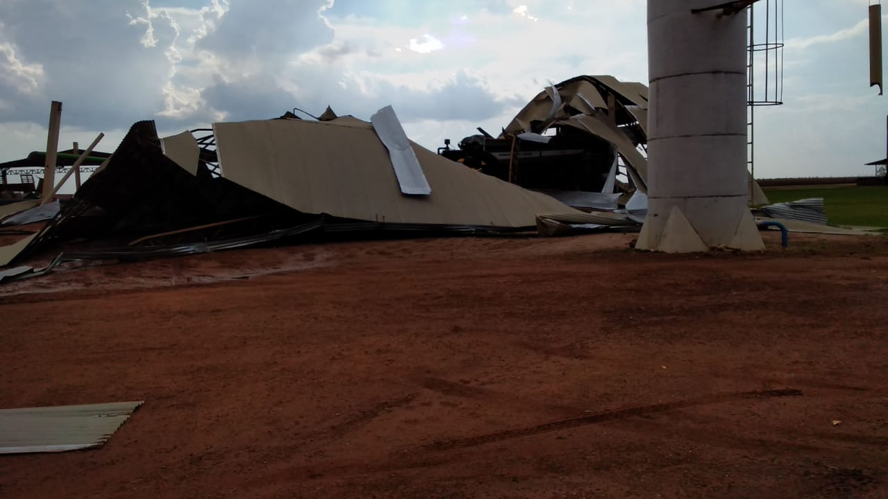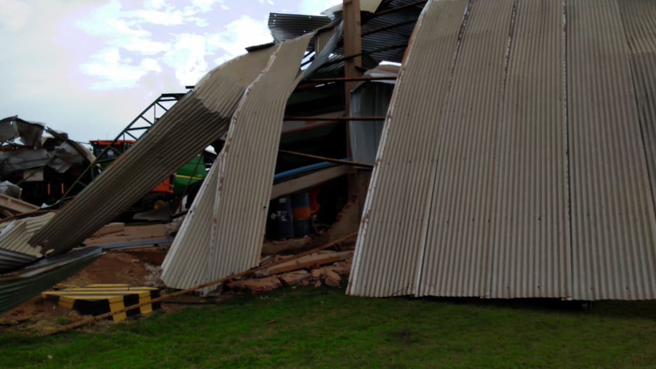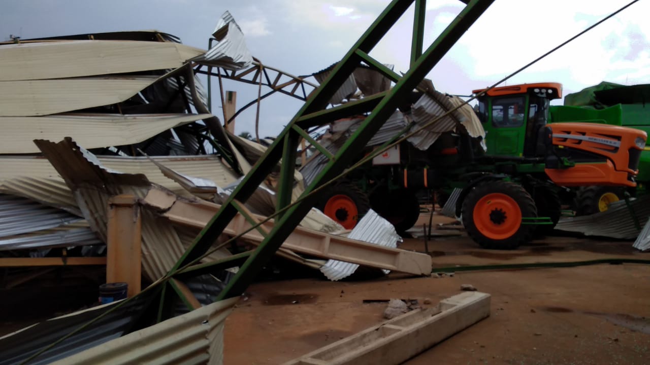 Maquinários avaliados em milhões de reais ficaram destruídos após queda de barracão, em uma fazenda em Campo Novo dos Parecis-MT. Um forte vendaval provocou a queda da estrutura que abrigava tratores, colheitadeiras, carretas e outros implementos agrícolas.
