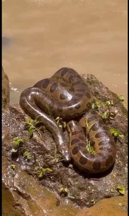 Uma cachoeira recebeu a visita de muitos banhistas que resolveram se refrescar. Para a surpresa deles, uma cobra sucuri também resolveu aparecer no local e aproveitar o lindo dia de muito sol.