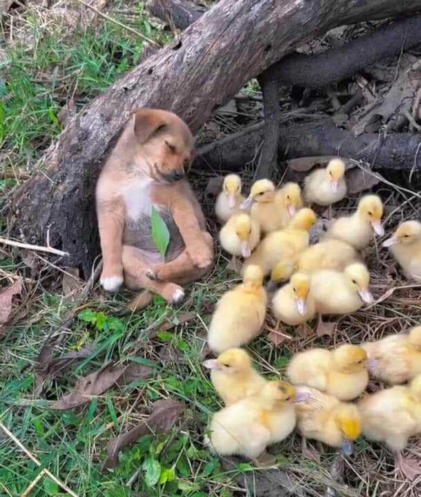 Uma cena fofa e inusitada está encantando internautas nas redes sociais e o Mundo Animal. Um cãozinho foi flagrado adormecido escorado em um tronco de árvore, ao lado de uma ninhada de patinhos. Ao adormecer, o cãozinho cai deitado ao lado dos patinhos e continua na maior soneca.