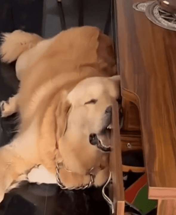 Um cãozinho da raça Golden Retriever foi flagrado dormindo profundamente escorado no móvel da casa de seu tutor. Nas imagens ele aparece com a boca aberta, como se estivesse mordendo parte de uma gaveta do móvel.