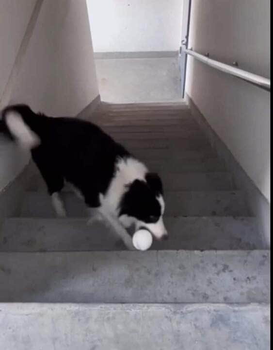Cãozinho se diverte ao brincar com bolinha em escada; VÍDEO SENSACIONAL