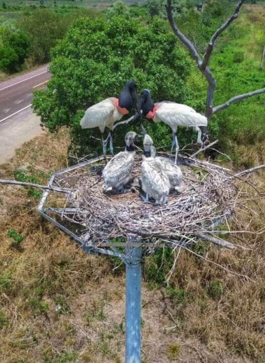 Casal de tuiuiús é fotografado em ninho protegendo os três filhotes