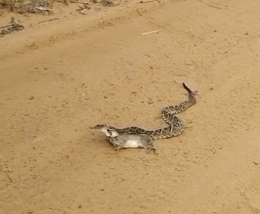 Em uma jornada rumo à roça, um homem se depara com uma cena espetacular e rara da natureza: uma cobra cascavel em pleno processo de predar um preá no meio de uma estrada.