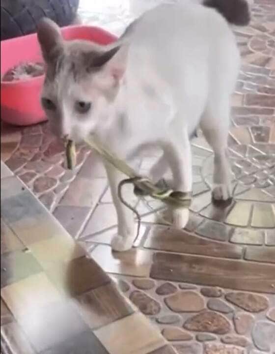 O gato caminhava pela casa exibindo a caça que havia conseguido, mas tinha dificuldade em locomoções com a cobra enrolada em sua pata. A cena inusitada foi flagrada por uma moradora da cidade de São Paulo, que compartilhou o vídeo nas redes sociais.