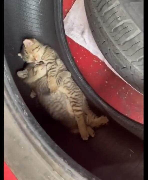 Dois gatinhos fofos foram flagrados dormindo dentro de um pneu e deixou o dono da borracharia surpreso. Impressionado, o homem fez a filmagem e postou nas rede sociais.