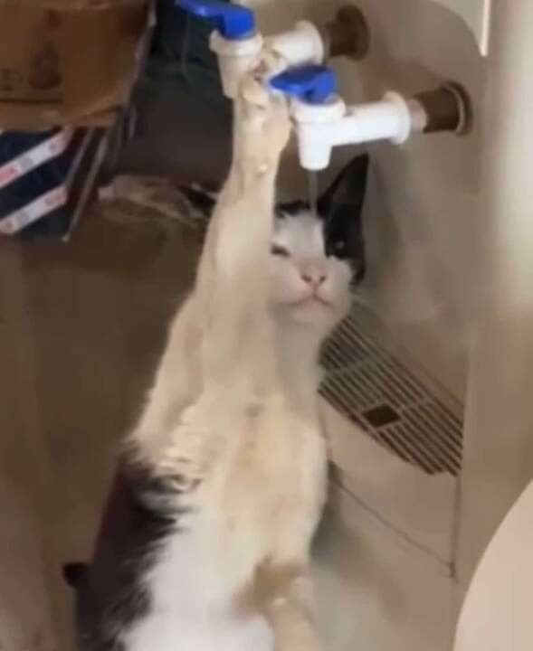 No vídeo abaixo, o gato aparece apoiado nas patas traseiras e consegue, com uma das patas dianteira, abrir a torneira do bebedouro. Com a água caindo, ele consegue tomar e se refrescar.