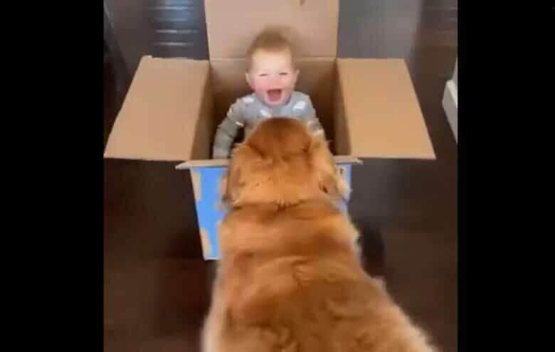 Golden retriever arrasta bebê em aventura com caixa de papelão e gera risadas infantis, bem como deixa os amantes do Mundo Animal admirados com tanta fofura em apenas um vídeo.