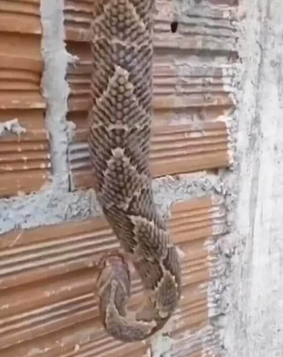 Impressionante; cobra jararaca pendurada em muro devoro sapo