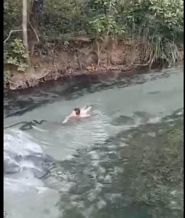 A mulher que faz a filmagem grita para a outra que nada no rio, para que ela saísse do local.