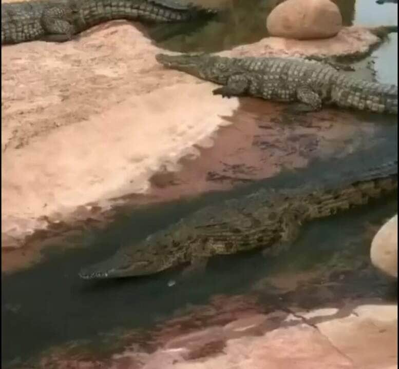 Nas imagens aparece um jacaré escorrendo e indo parar direto em uma espécie de lagoa, onde estão outros animais.