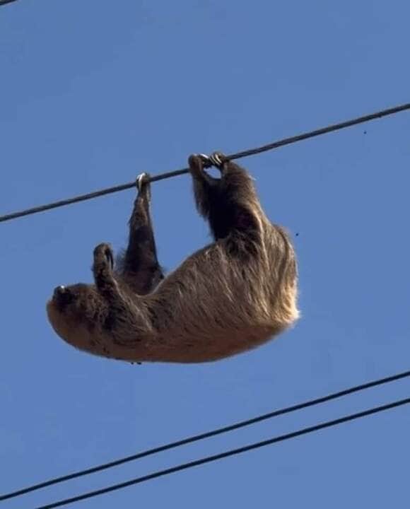 Um bicho preguiça foi encontrado pendurado em fios de uma rede de alta tensão. O vídeo viralizou nas redes sociais e a pergunta que não quer calar é: como o bicho preguiça conseguiu chegar até ali?
