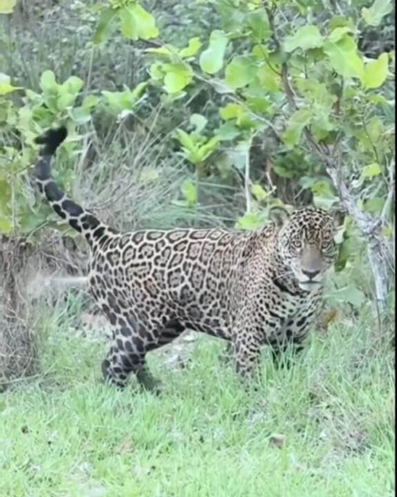 Nas imagens, a onça-pintada aparece urinando em um tronco de árvore. Esse comportamento é comum em onças-pintadas e é uma forma de demarcar território.
