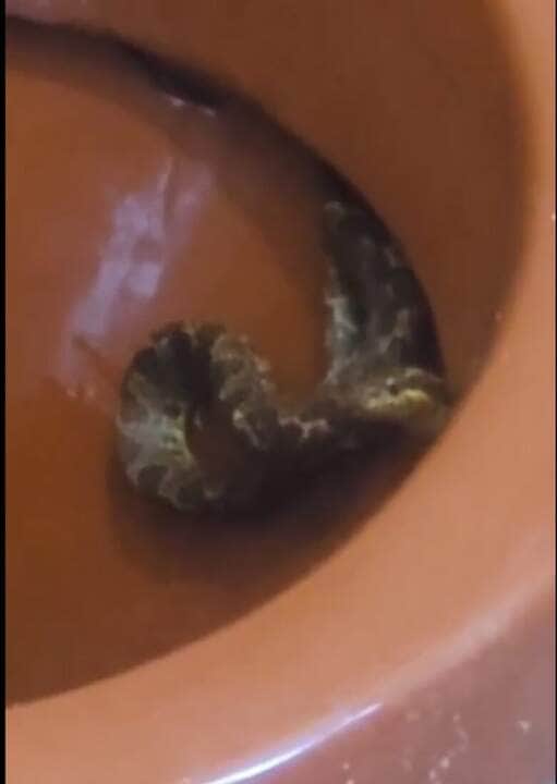 Uma cobra jararaca, mais especificamente uma jararaca-cruzeira ou popularmente conhecida por jararaca-boca-de-sapo, foi encontrada dentro de um vaso sanitário.